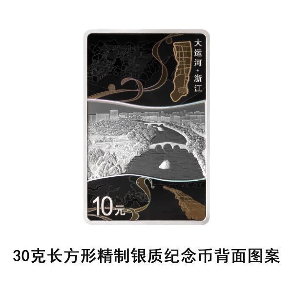 30克长方形银质纪念币背面图案以浙江杭州拱宸桥及历史文化街区为主要场景,衬以绍兴古纤道、宁波庆安会馆、南宋临安城平面图、浙东运河古地图等,并刊“大运河·浙江”字样及面额。