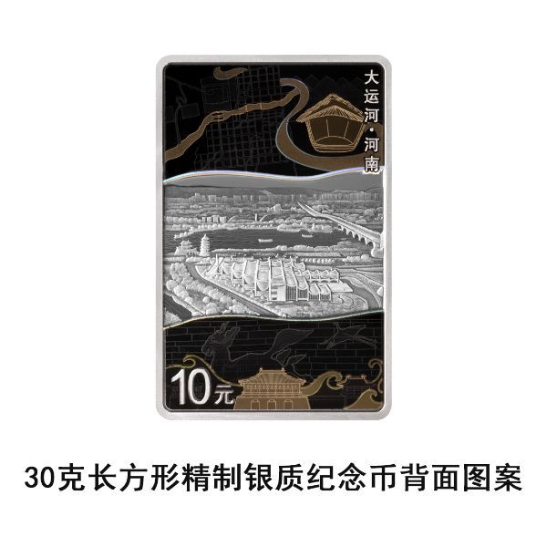 30克长方形银质纪念币背面图案以河南洛阳洛河为主要场景,衬以回洛仓、定鼎门、开封北宋州桥石刻壁画、隋唐洛阳城平面图等,并刊“大运河·河南”字样及面额。