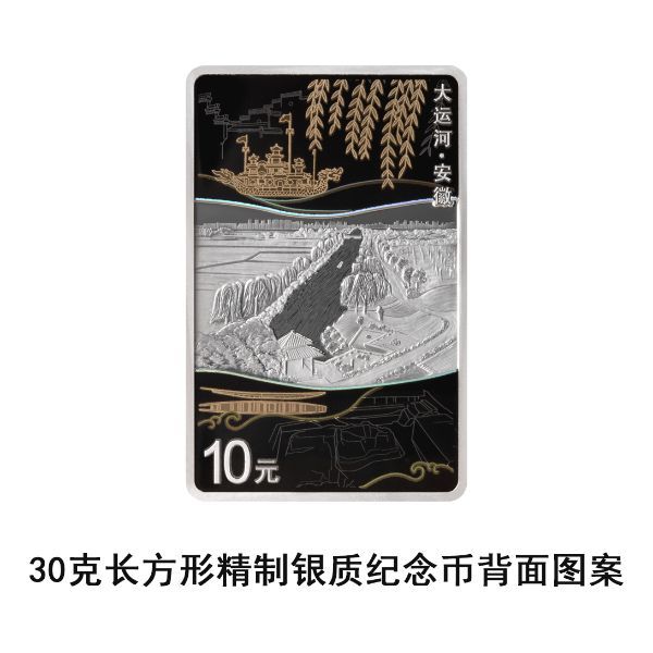 30克长方形银质纪念币背面图案以安徽通济渠泗县段为主要场景,衬以徽派建筑、龙舟、柳枝、柳孜运河遗址、出土古船复原图等,并刊“大运河·安徽”字样及面额。