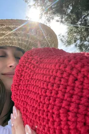 照片中的海莉戴着一顶宽边柳条帽,而杰克戴着一顶甜美的红色钩针帽子。第二张照片里,小男孩双手朝妈妈举起,妈妈抱着儿子的时候闭着眼睛,照片中还可以看到她彩虹般的指甲。当海莉与5430万粉丝分享这些照片时,她用了一个燃烧的心的表情符号。