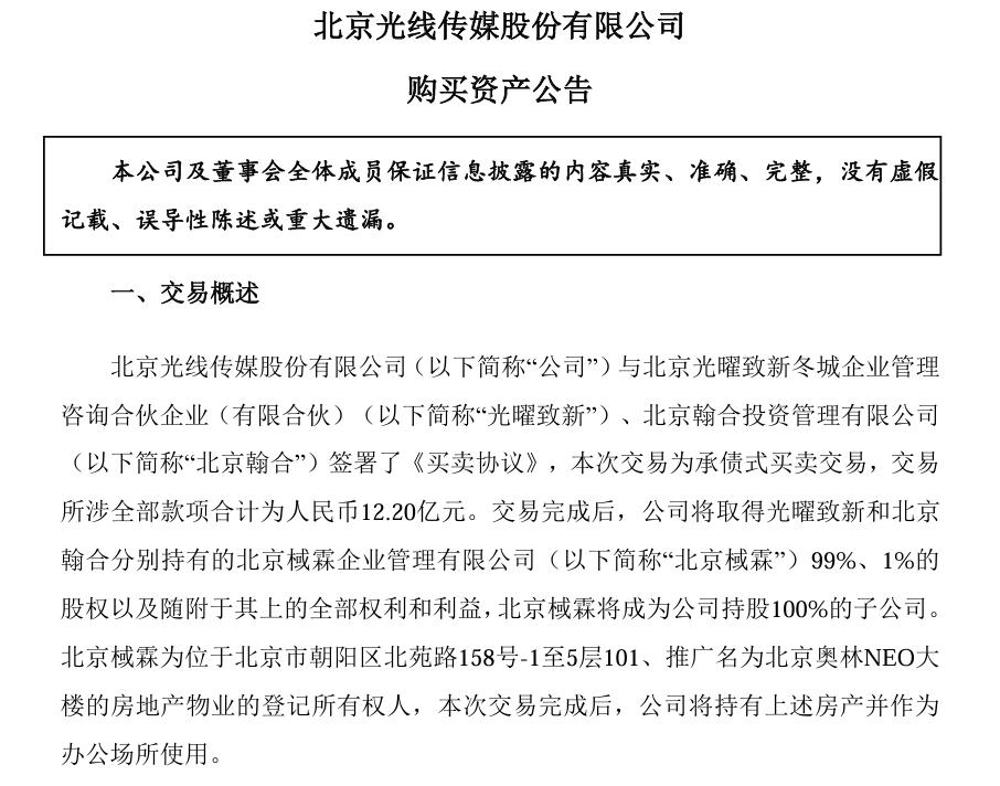 对于本次交易的目的和影响,光线传媒表示,本次交易完成后,公司将北京棫霖持有的北京奥林 NEO 大楼作为办公场所使用,对公司的战略规划、生产经营、资产优化、人才培养等方面具有长远意义。