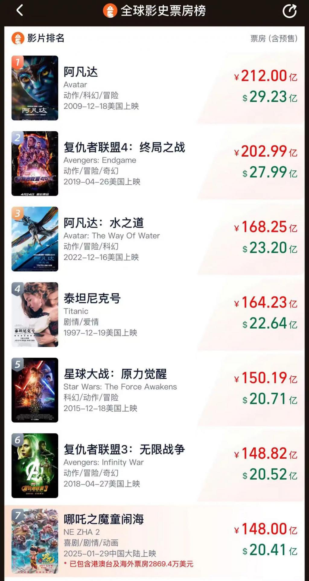 光线豪掷 12.2 亿元买楼背后,是其主投电影《哪吒 2》的票房大卖。据网络平台数据,截至发稿,总票房已至 148 亿元,目前位居全球影史票房第 7 位,距第 6 位《复仇者联盟 3:无限战争》仅差约 0.82 亿元。