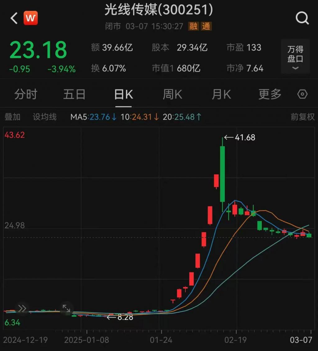 电影大卖带动了光线传媒股价大涨。截至 3 月 7 日收盘,光线传媒股价报 23.18 元 / 股,春节以来涨幅高达 143.23%。
