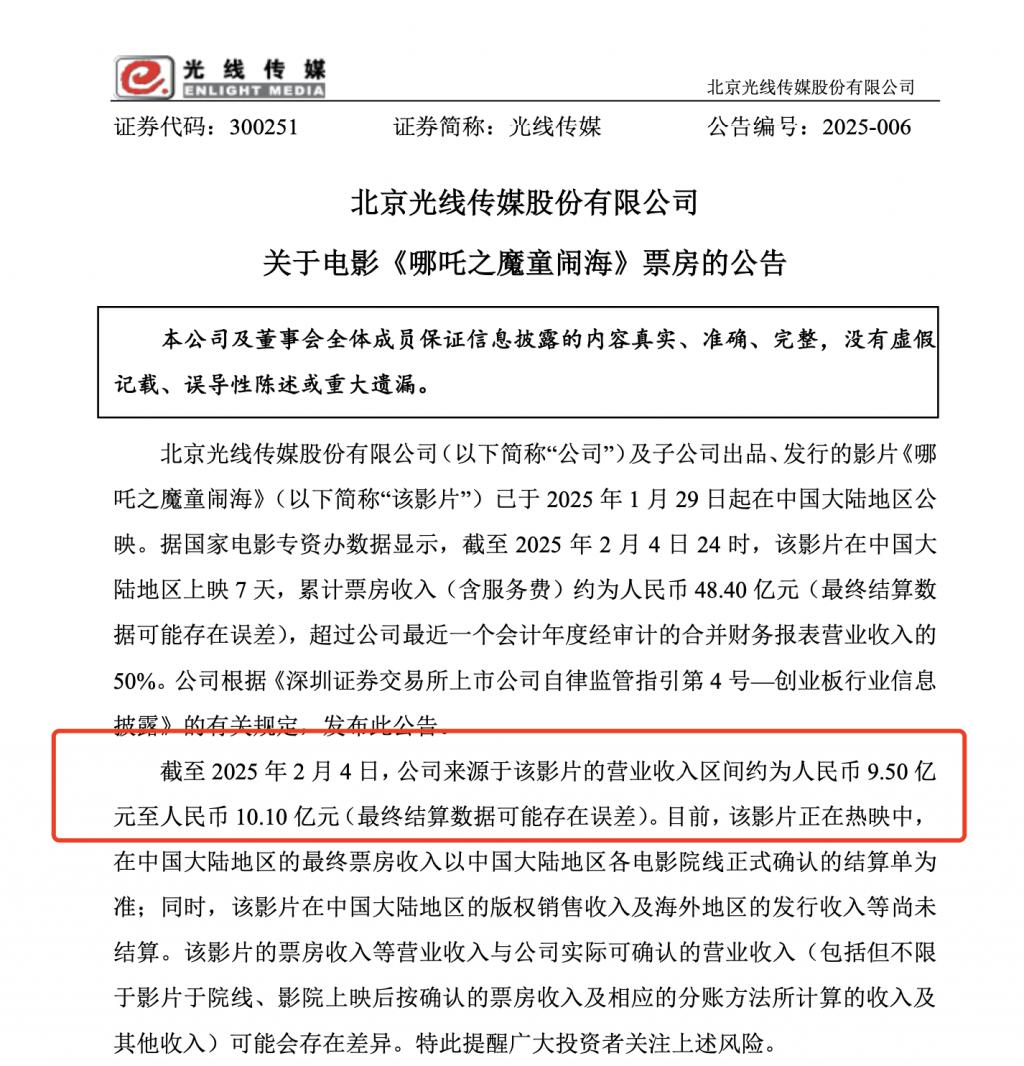 此外据蓝鲸新闻,据光线传媒此前公告,截至 2025 年 2 月 4 日,《哪吒 2》累计票房收入(含服务费)约为人民币 48.40 亿元,公司来源于该影片的营业收入区间约为人民币 9.5 亿元至人民币 10.1 亿元。