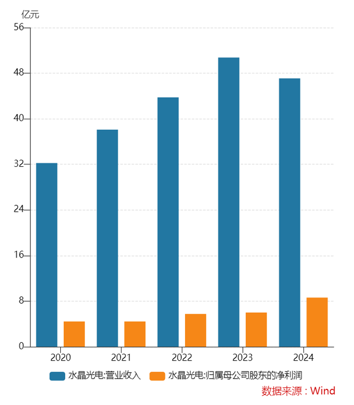 机构预测水晶光电接下去两年的业绩未能延续此前的高增速。国盛证券研报显示,预计水晶光电在2024/2025/2026年分别实现营业收入66/79/92亿元,同比增长30%/20%/16%,实现归母净利润11.0/12.6/15.2亿元,同比增长83%/15%/21%。