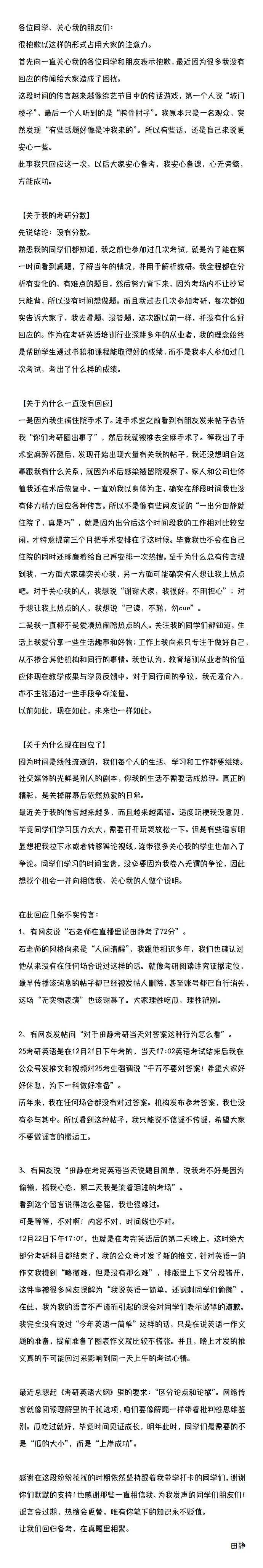 首页 > 资讯 考研名师田静发长文致歉并回应英一成绩:没有分数,大家理性吃瓜 3 月 11 日,考研英语名师田静发长文回应近期热点并致歉。长文中田静解释自己相关英语一考研成绩问题,称进考场是为了看题,没有成绩。并称自己前段时间生病住院所以未能及时回应。此外还称完全没有想搞大家心态,并对考后不妥表达道歉。同时还就不实传言进行辟谣,声称自己从未说过相关 " 人间清醒 " 等言论。文中最后提到后面会专注教学,和大家一起进步。潇湘晨报综合