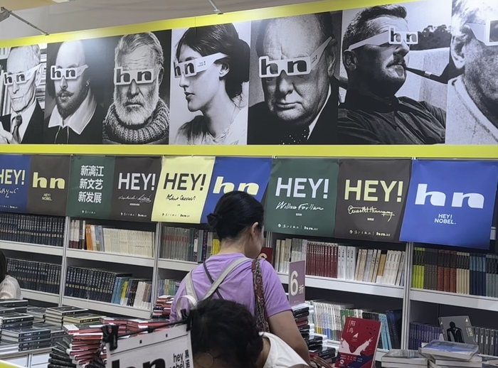 文学奖与作者受曝光的声量是各大出版展位推书的依据。有关茅盾文学奖得主金宇澄的《不响》还有孙甘露的《千里江山图》的宣传被印制成巨幅海报粘贴在上海文艺出版社的墙上,新经典文化则单独开辟一块“余华文学小卖部”供读者集中选择。在果麦文化展位,林俊杰、邓紫棋和脱口秀演员小佳这类明星的书籍被并列摆放。时下的热点也不能跟丢,凤凰出版传媒集团趁着书展时机推出新书《苏超来了》,用书堆出五星形状,还在展柜粘贴了苏超在足球场拍摄的照片,一时引来不少围观。