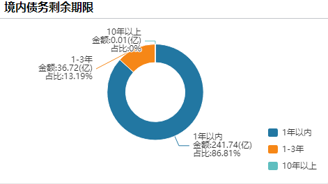 Wind数据显示,截至目前,万科境内债务共有279亿元,其中一年以内到期的境内债务约241.74亿元,占比达到86.81%,未来12个月的兑付高峰在今年12月份,共有58.71亿元债务要偿还。