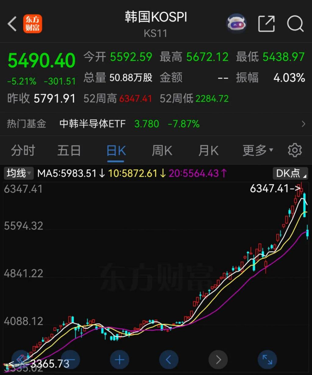 韩国股市连续两日大跌。今日盘中,KOSPI指数一度跌至6%。韩国央行称,将密切关注汇率和利率的过度波...