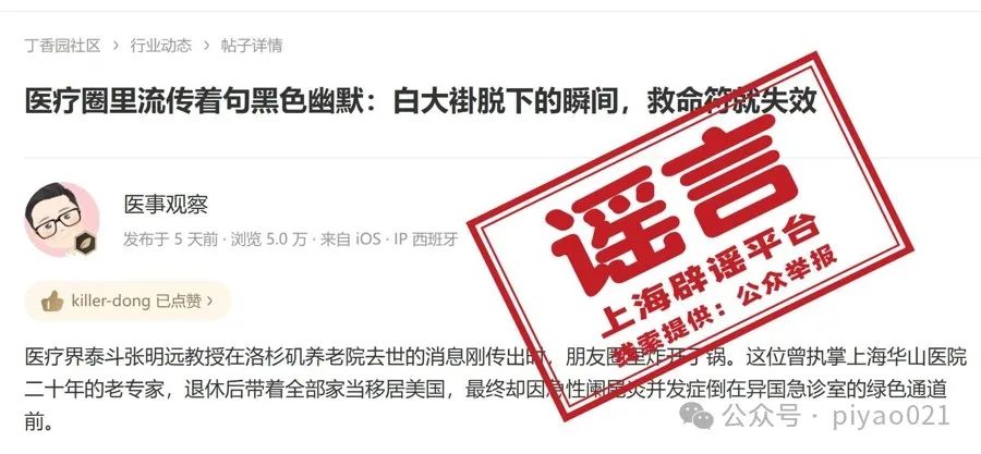 “华山医院前院长”因救治不及时客死他乡?警惕这种虚构信息资讯