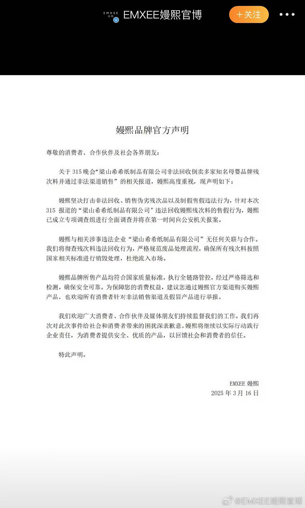 嫚熙回应卷入“翻新卫生巾”事件:成立调查组将彻查残次料回收资讯