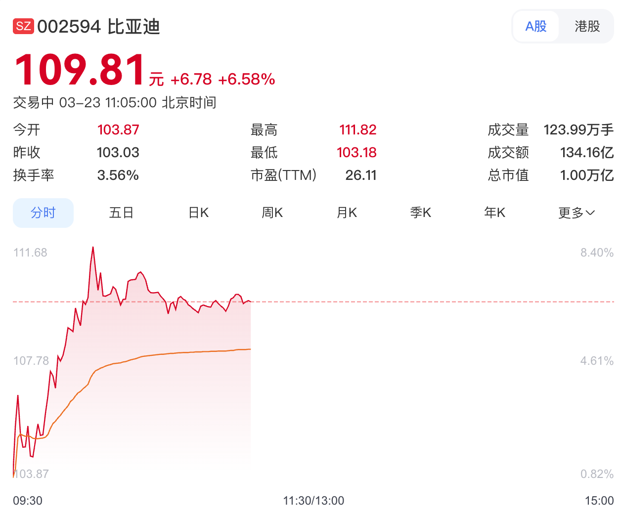 3月23日,比亚迪(002594.SZ)开盘即上涨,盘中涨幅一度超8%,公司总市值重回万亿元区间。截...