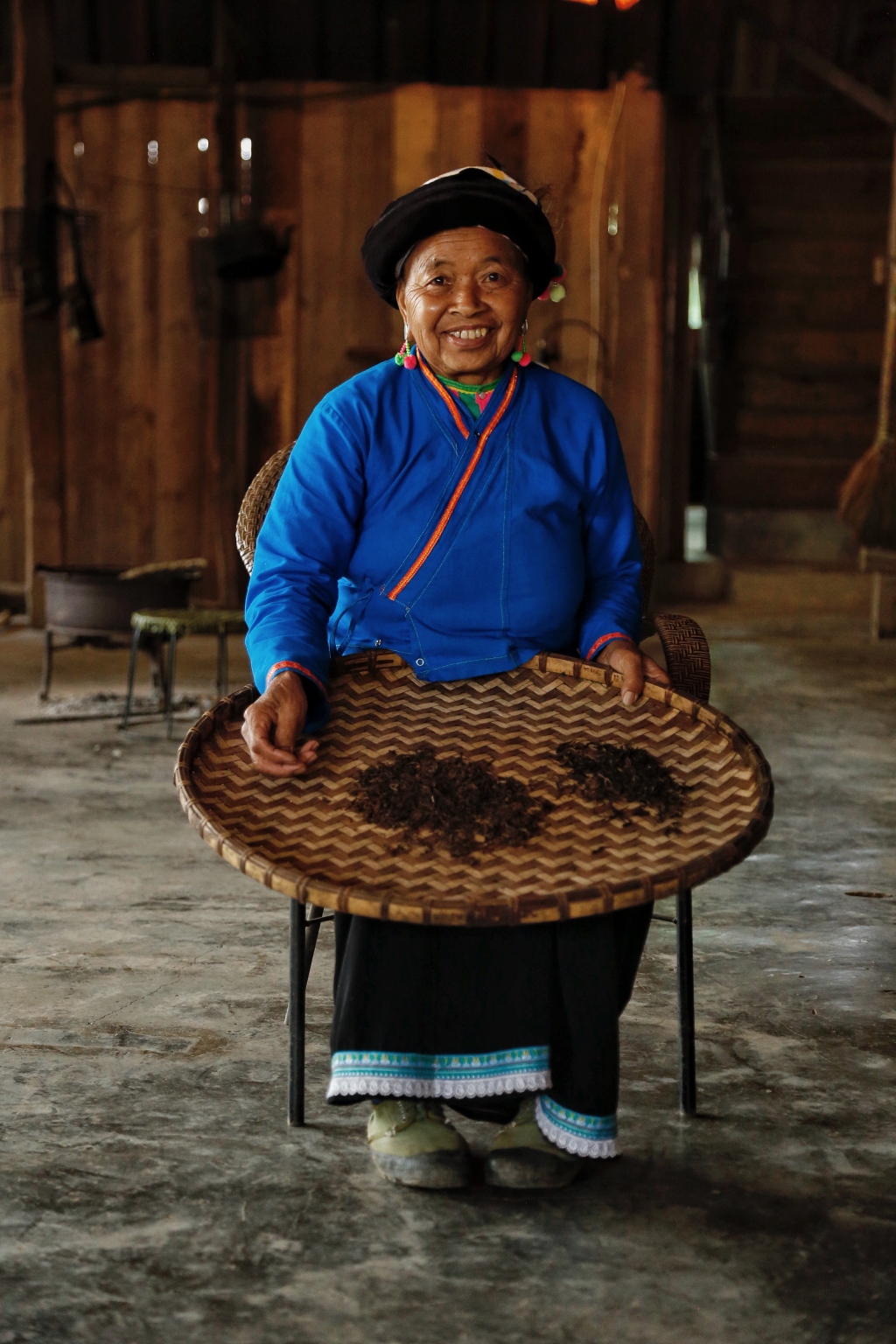 《叶掇与晒茶》图为布朗族奶奶叶掇与自家晒干的茶叶。茶是景迈山布朗族的信仰寄托,布朗族认为他们的祖先是茶祖,茶祖用茶叶救了迁徙途中布朗族的性命。现在茶叶也成为布朗族最重要的经济作物,来自外界的工夫茶泡法也深入影响了本地人饮茶生活。