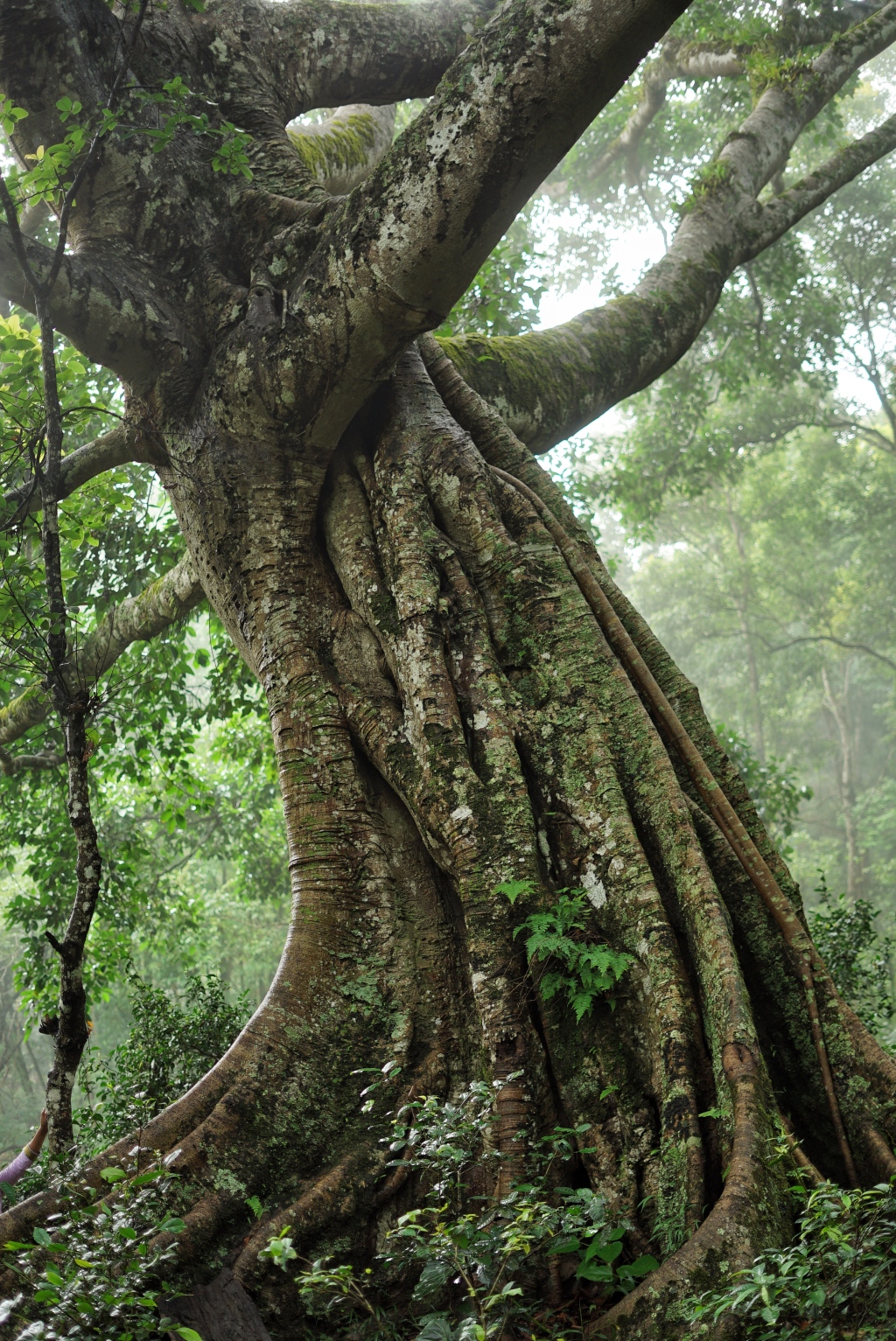 这些关于灵性植物的故事,我不仅从Kupia那里听到,还从芒景村的许多布朗族老人那里得知,尊重神树已经成为族内约定俗成的规则。根据我的观察,这些被赋予类似神圣性与能动性的树,多属于高大乔木,是古代族人在缺失观测工具的情况下难以触及的自然一隅。当我行走在山上的原始森林间,抬头向上望去,它们的树干高耸入云,有些树冠能遮蔽天空。那遥远神秘的树冠层寄托了布朗族宇宙观里最朴素的浪漫想象、恐惧与敬畏。