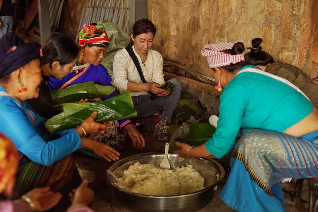 《布朗族妇女制作饭包》在傣历中间节的第一天,布朗族各个寨子的妇女会自发集结起来,分工有序,制作敬献祖先等贡品。