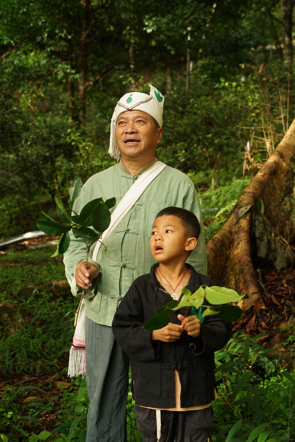 《南康爷孙与茶叶传承》图为布朗族非遗烤茶传承人南康书记与他的孙子,二人手握茶叶,采自古茶林里的古茶树。茶叶是景迈山最重要的植物之一,关于茶叶采集知识与信仰传说,将在布朗族代际之间传承。