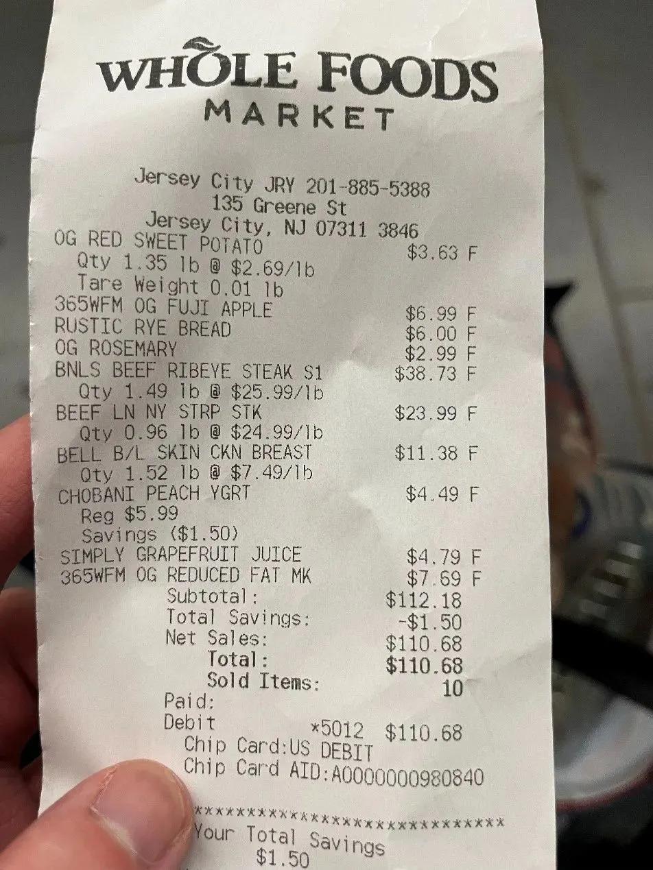 此外,在纽约生活的雷先生也对记者表示,现在超市里鸡蛋和奶制品现在都很紧缺。他最近去了一次超市,想购买鸡蛋,但发现货架都是空的,另外,想要的黄油也没货。雷先生还给每经记者展示了他的消费小票,并表示这大概就是他一周食物储备需要花的价格(110.68 美元)。