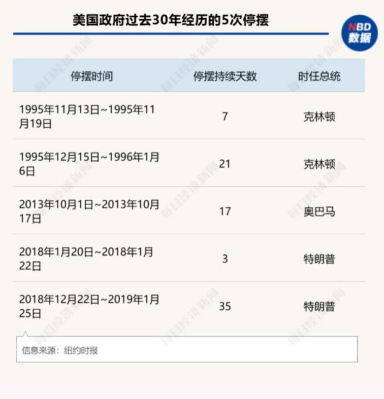 自 1976 年以来,美国联邦政府出现了 20 次停摆。特朗普上一次任美国总统时,联邦政府先后两次停摆。这两次停摆中,2018 年 12 月的停摆持续了 35 天,成为美国历史上最长的政府停摆。当时,围绕国会预算案拨款建造美墨边境墙问题,两党僵持不下,造成美国经济损失约 30 亿美元。