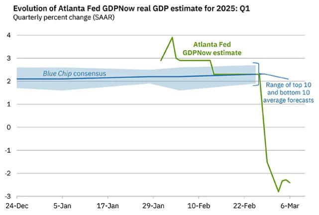 上周,亚特兰大联储的大幅下调了美国一季度 GDP 预期,其发布的 GDPNow 跟踪器显示一季度经济年化增速为 -2.8%,进一步加剧了衰退担忧。