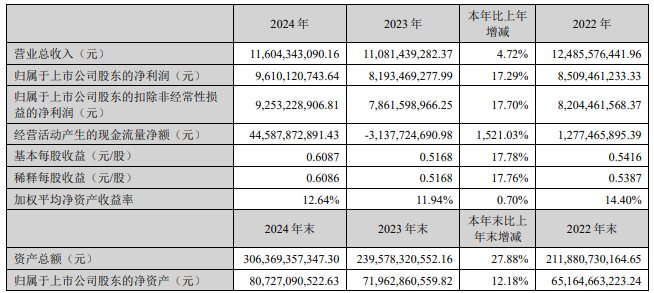 3月14日晚间,东方财富发布《2024年年度报告》表示,报告期内,公司营业总收入为116.04亿元,同比增加4.72%;实现归属于上市公司股东的净利润(下称“净利润”)96.10亿元,同比增加17.29%。
