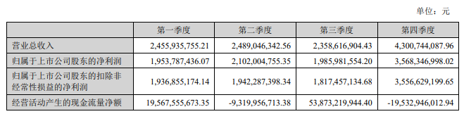 其中,营业收入2024年第一至第三季度分别为24.56亿元、24.89亿元、23.59亿元;净利润分别为19.54亿元、21.02亿元、19.86亿元。