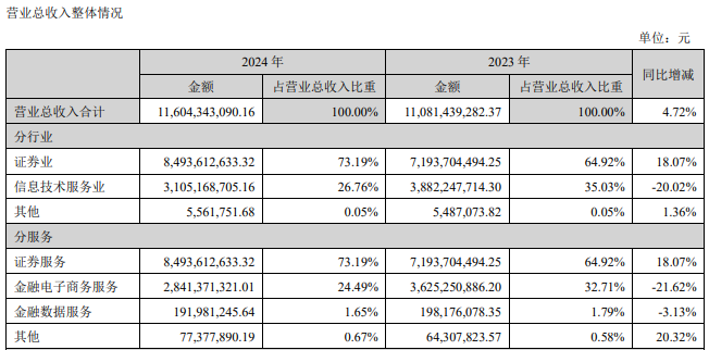 分产品来看,证券服务产品营收在总营收中占比最高为73.19%,金融电子商务服务营收占比为24.49%,实现营收28.41亿元,同比减少21.62%;金融数据服务营收占比为1.65%,同比减少3.13%。