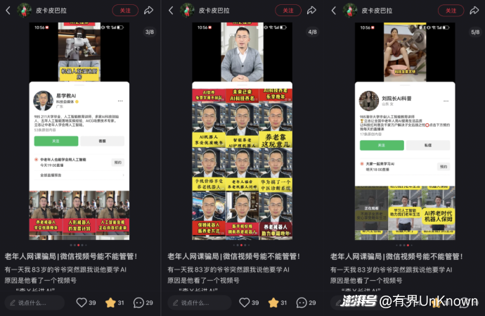 一位广东的网友表示,他翻看了父亲关注的视频号,发现好几个普遍都打着“985博士毕业”“多家AI公司创始人”这样的标签,以教老人如何使用养老机器人、用AI制作短视频赚钱等理由,向老年人卖课。