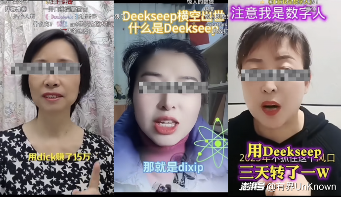 此外还有一些更粗糙的视频内容,也是由老年人录制,他们说着类似的话术,比如“用d**k(注:即DeepSeek,老年人不会说这个单词)三天赚15万,普通人也能翻身”“普通人如何用AI赚钱,D**k ske已经给出了答案”,然后引导观众购买相关课程。