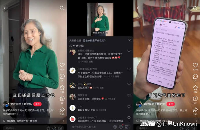 我们发现,社交平台上涌现了越来越多老年人精致生活的视频。这些视频中,阿姨们活力四射、容光焕发,和观众分享着自己每天学习AI的心得体会。