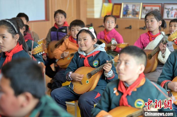 中新社记者近日探访玛曲县寄宿制藏族小学弹唱社团活动,未进教室,已听到室内传出的欢快琴声和笑声。