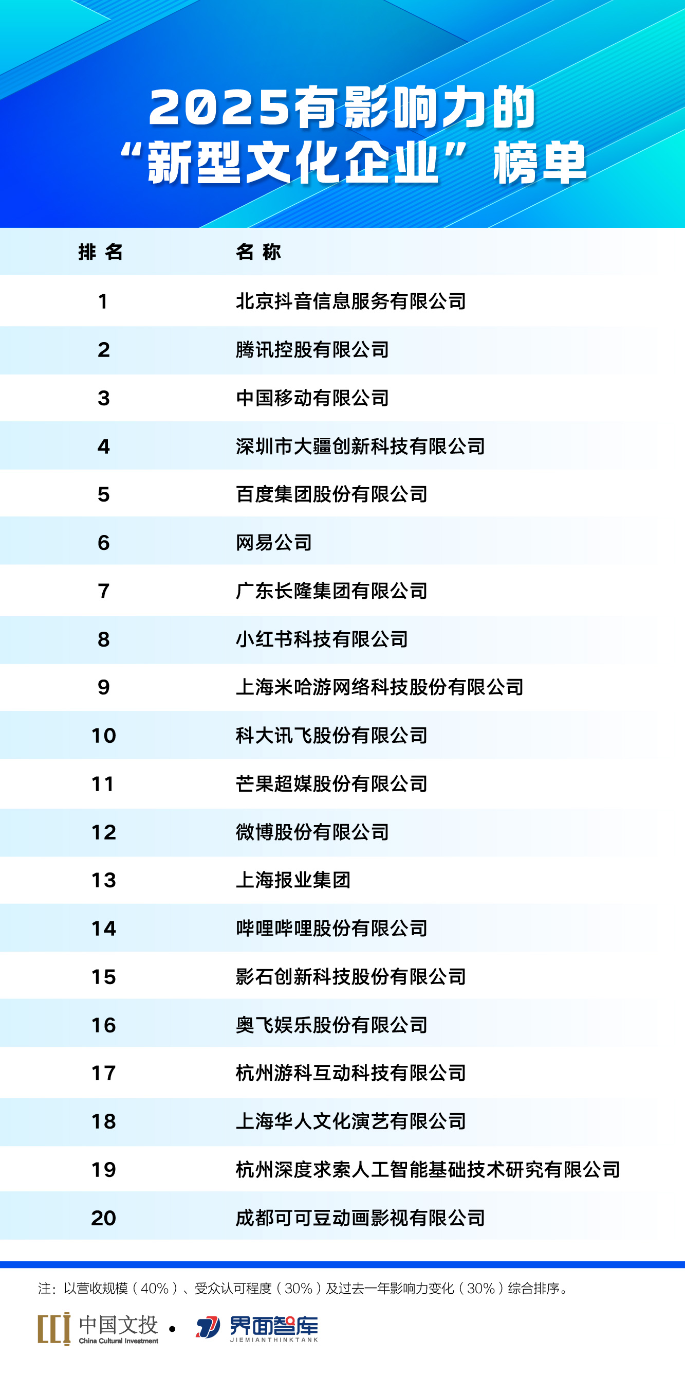 基于上述“3+2”分类框架,本次评选自5000家企业样本池中,通过“初筛—精筛—终筛”三级评估机制最终确定榜单结果。初筛阶段基于企业规模、行业曝光和负面舆情等客观指标,筛选出60家候选企业;精筛阶段采用定量与定性相结合的评估体系,针对内容突破类、形态变革类和融合发展类企业设置差异化指标,结合公开数据、候选企业问卷调研及专家评审,遴选出各类别前10企业;终筛阶段则重点评估企业在“科技赋能文化”和“文化赋能经济社会发展”方面的综合能力,最终确定“2025有影响力的20家‘新型文化企业’”。以营收规模(40%)、受众认可程度(30%)及过去一年影响力变化(30%)综合排序,名单如下: