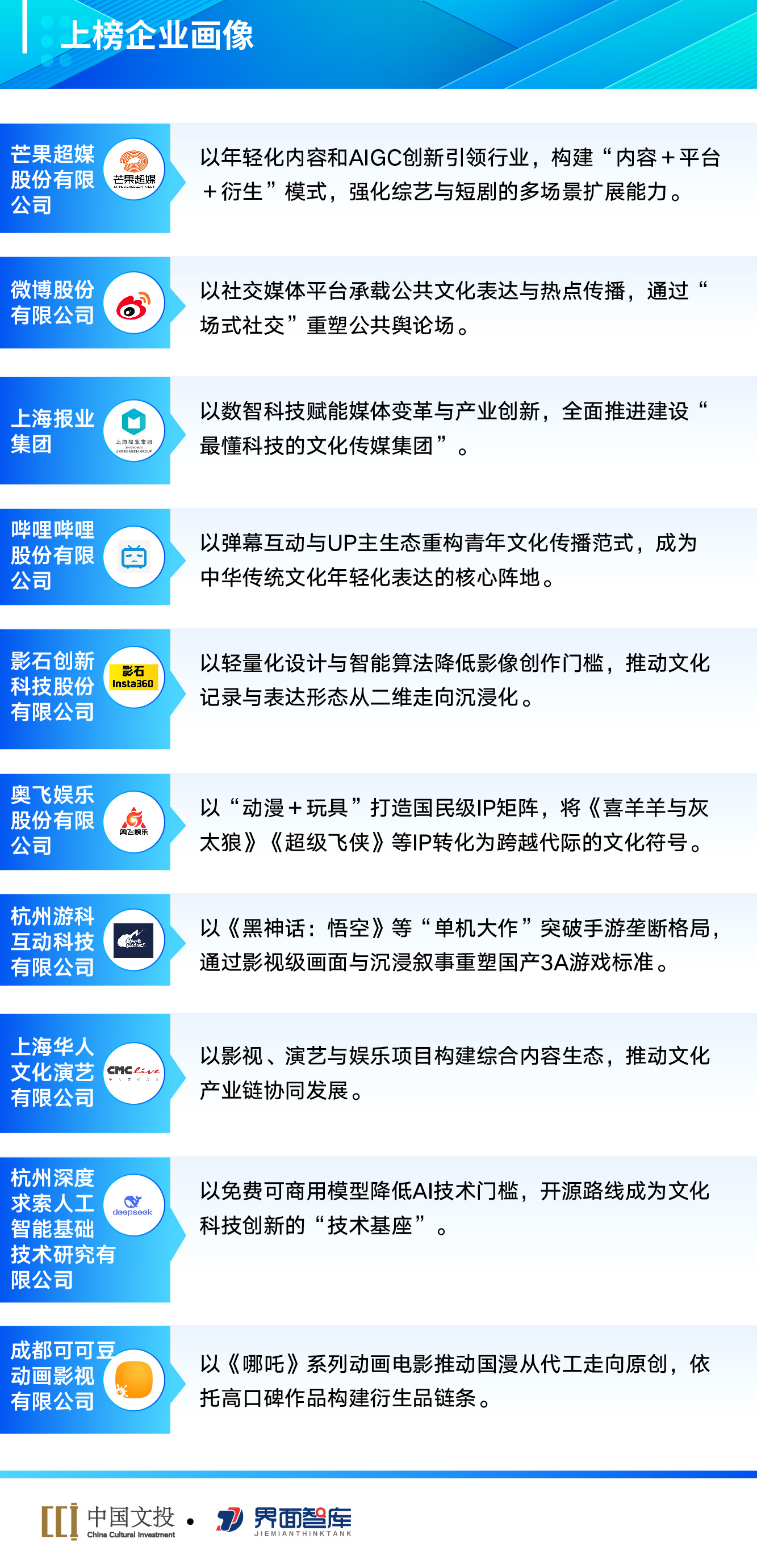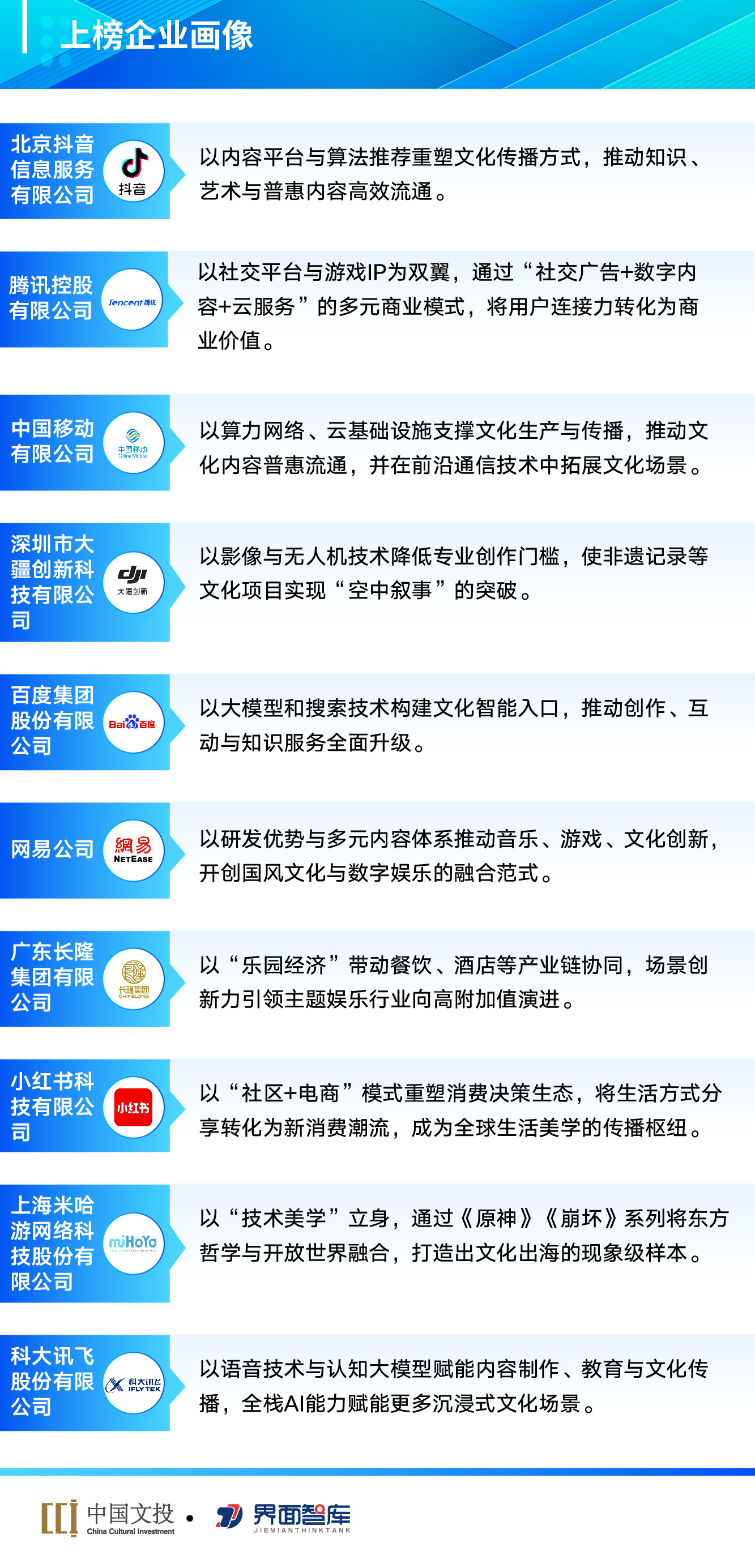 过去评价文化企业更多聚焦内容数量、IP 影响力与用户规模,如今,技术能力、模型能力、平台能力正成为文化企业核心价值的新增量,科技价值逐步成为文化企业的“硬核资产”。上榜企业中,科大讯飞、深度求索等企业的技术底座,是赋能文化产业发展的关键支撑;米哈游、网易、游科互动既依托自研引擎、实时渲染、技术美学构建全球竞争力,也持续深耕内容创意;大疆、影石创新以 “硬件 + 算法” 双引擎重塑影像生产范式,同步推动内容创作向智能化升级。
