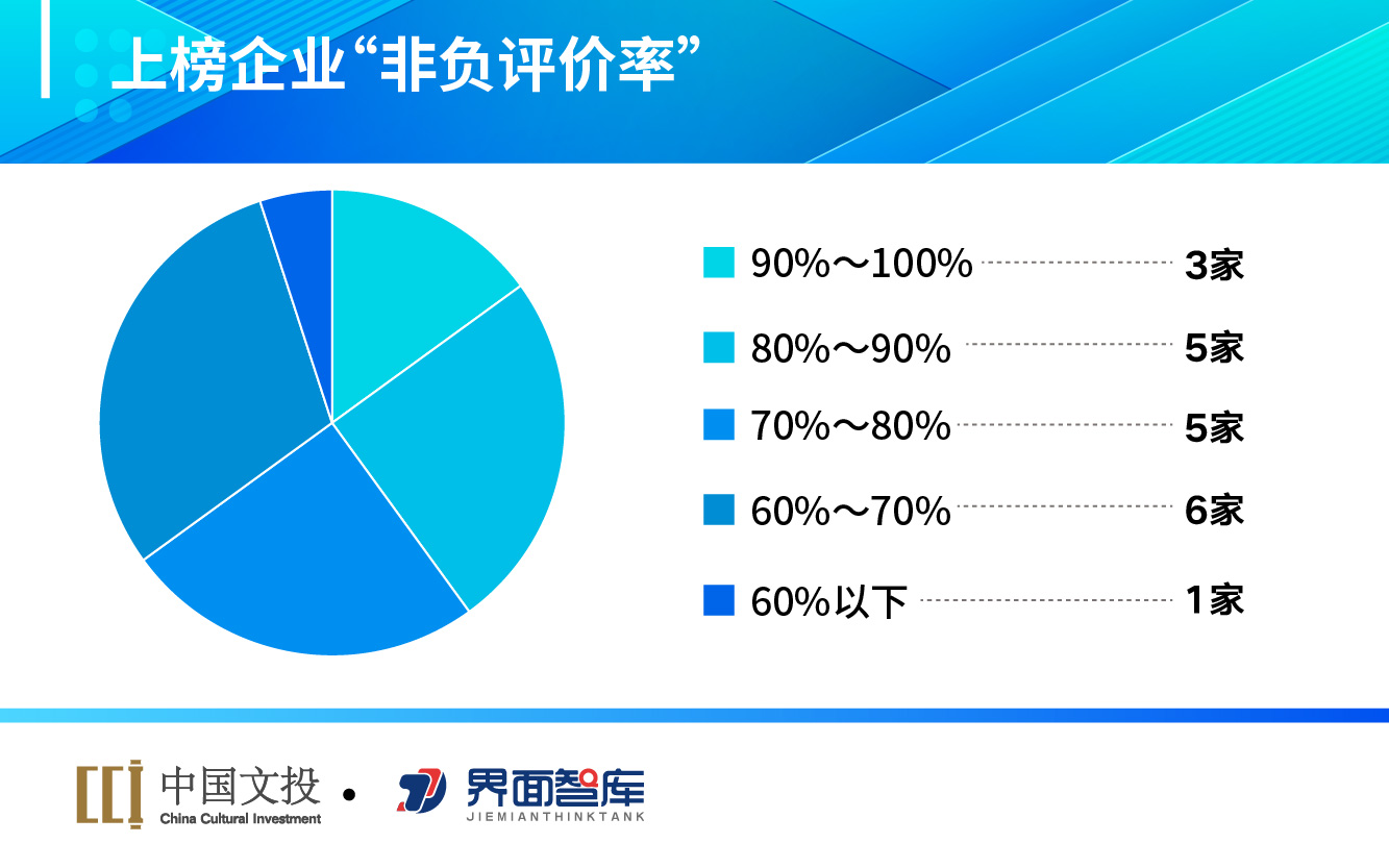4.舆情评价:高口碑企业形成强黏性。可可豆动画、大疆创新与影石创新的非负面评价率均超过90%。其中,可可豆动画凭借优质的动画内容创作,收获了市场的高度认可;大疆创新与影石创新也凭借无人系统与影像技术,在各自领域建立起用户忠诚与专业口碑。整体来看,上榜企业的舆情“非负面评价率”中位数为77.4%,这说明随着企业影响力提升,其产品创新与服务优化愈发受到社会关注,公众讨论度上升的同时,也为企业提供了更广阔的改进空间与品牌塑造契机。