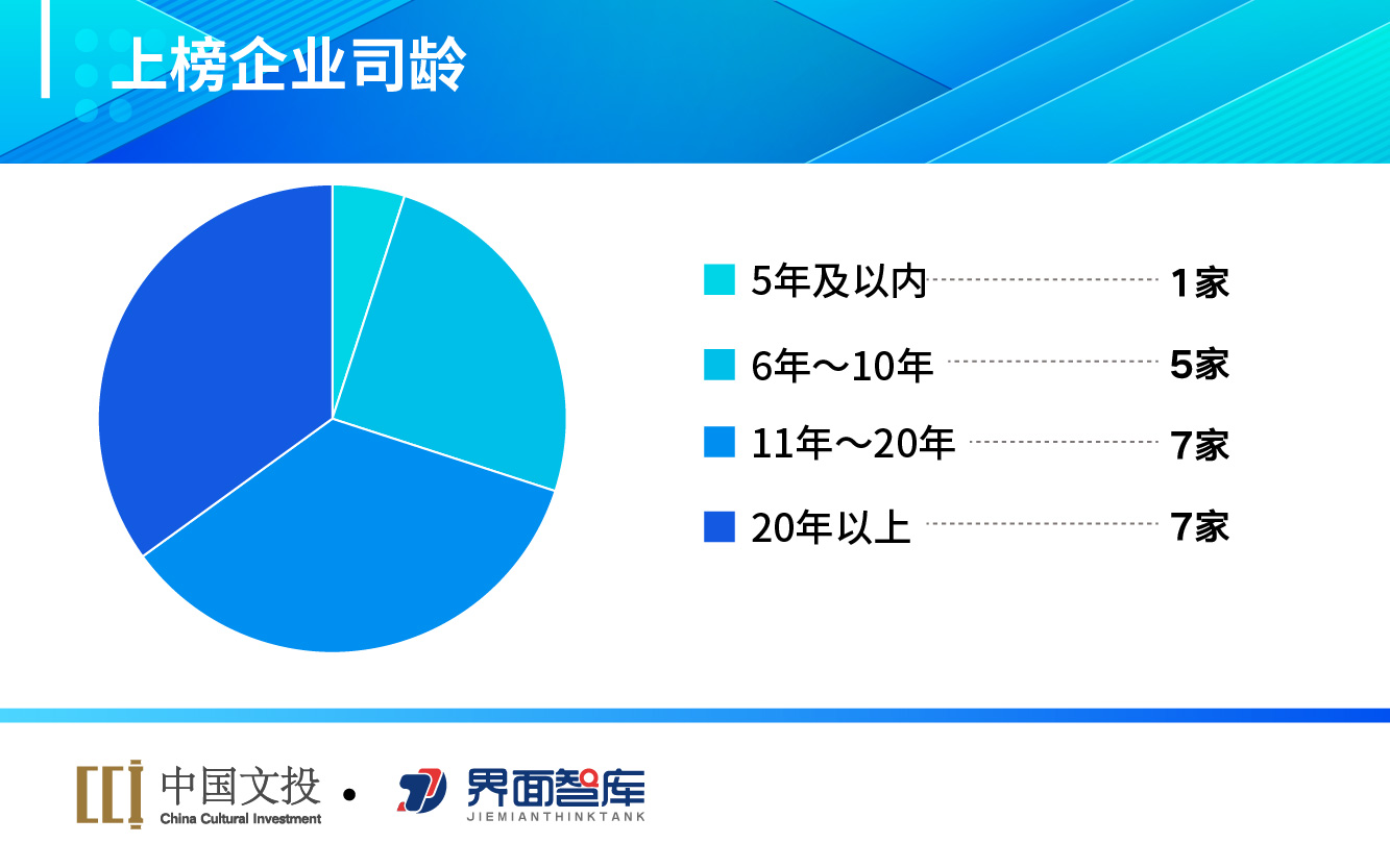 2.成立时间:资深玩家—中生代—新势力三足鼎立。7家企业是成立超过20年的资深玩家,它们穿越了完整的互联网周期,具备进化能力、战略定力和资本优势。成立时间在11-20年之间与10年以内的企业分别有7家和6家,其中既有抖音、米哈游、游科互动、大疆、影石创新等行业代表,更有像深度求索这样成立仅2年多却手握特色大模型的“未来之星”。
