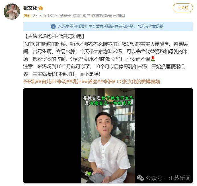 经站方巡查发现,用户 @张玄化 多次发布所谓 " 米汤代替奶粉 " 等无相关科学依据的内容,感谢热心网友添加的附注,站方也对相关内容进行了打签说明。