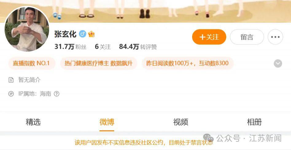 3 月 15 日,话题 # 微博账号张玄化发布健康谣言被禁言 # 冲上微博热搜。