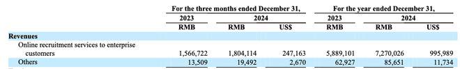 以 2024 年为例, 73.557 亿的营收里,企业客户的在线招聘收入有 72.7 亿,占到了整体营收的 98.8% 。 " 其他 " 占的份额,几乎可以忽略不计。