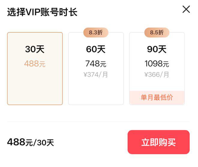 如果不选年框,开通单月 VIP 会员的话,一个月就是 488 元,同样的,这个会员也包含了一部分权益,比如可以发布三个竞招岗位,每天有 60 个沟通权益。