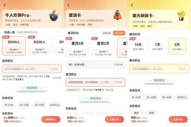 什么牛人炸弹 Pro 、置顶卡、曝光刷新卡,这些功能照样要另外花钱,会员只不过是能给点折扣罢了。