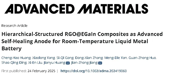 澎湃新闻记者注意到,近日,福建福耀科技大学蒋建中、燕山大学黄建宇团队的论文以《Hierarchical-Structured RGO@EGaIn Composites as Advanced Self-Healing Anode for Room-Temperature Liquid Metal Battery》为题,刊登在材料科学领域顶级刊物Advanced Materials上。