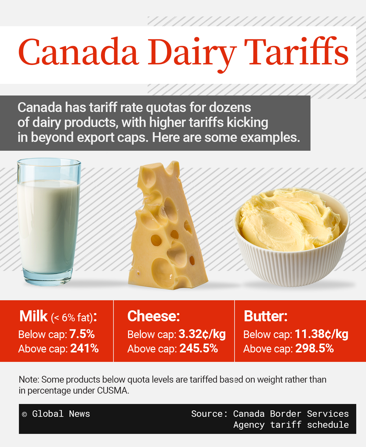 联邦政府告诉环球新闻,到目前为止,加拿大进口的美国乳制品还没有受到这些更高关税的影响。