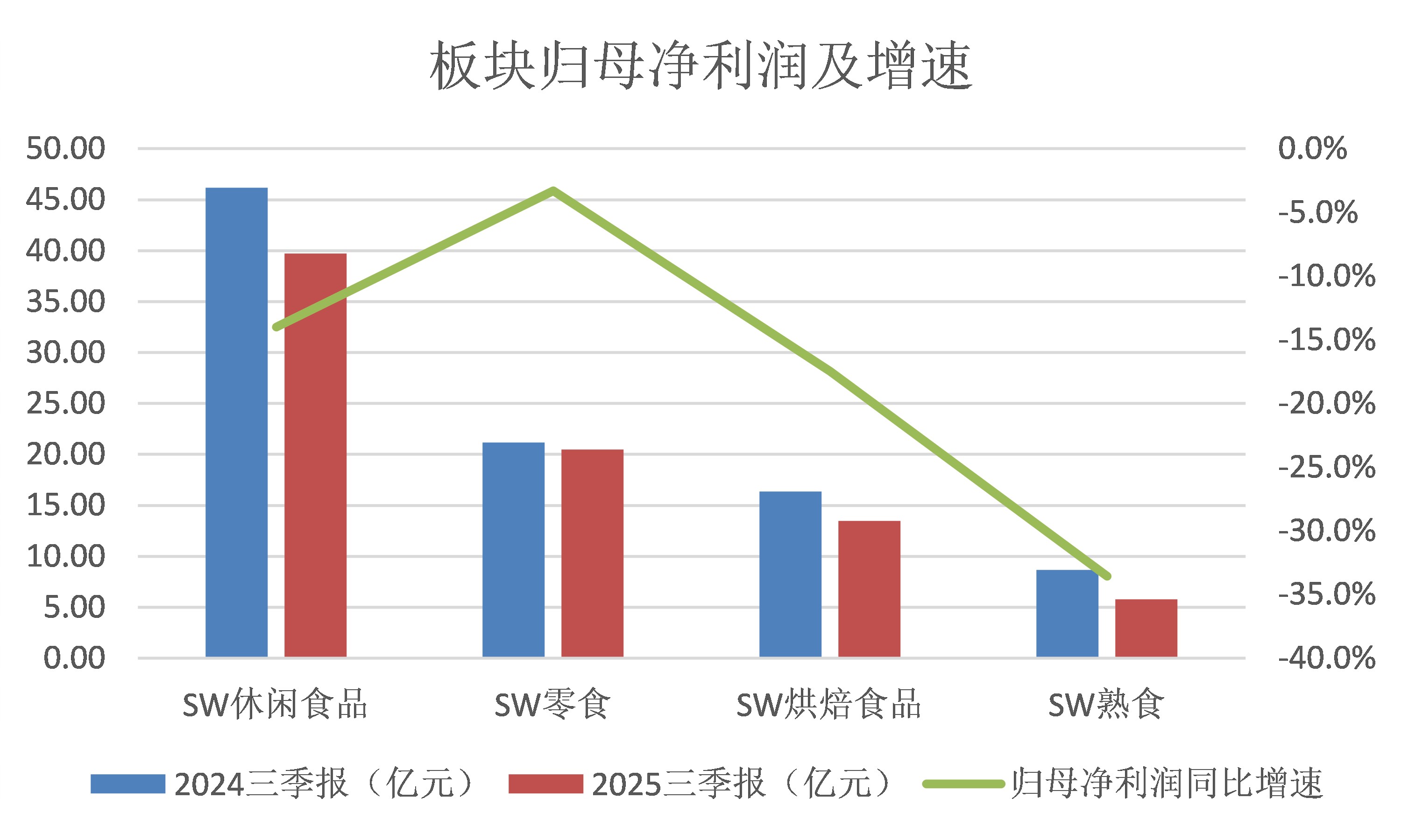 比营收分化更值得警惕的是“增收不增利”的行业困境。同期数据显示,休闲零食板块归母净利润合计39.69亿元,同比下滑14%。细分来看,零食板块虽也出现3.3%的净利润微降至20.46亿元,但已显著优于行业平均;烘焙与熟食板块成为业绩拖累主力,归母净利润分别大幅下滑17.5%和33.6%。盈利能力的收缩更为全面,2025年行业整体毛利率较2024年普遍下滑约3个百分点,各细分领域无一幸免。
