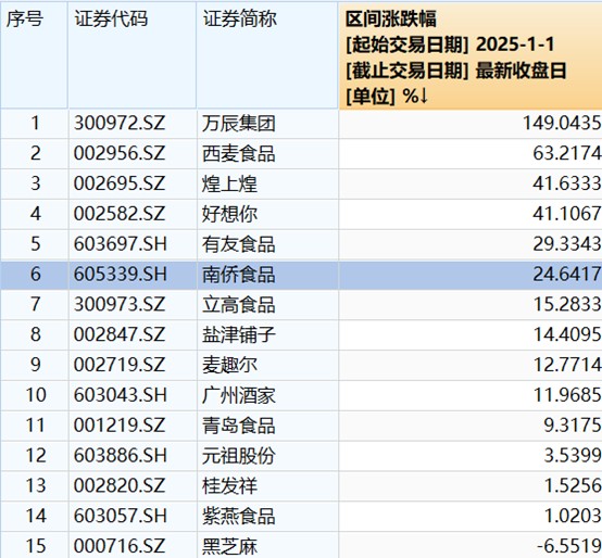 两种统计口径的巨大差异,指向一个结论:2025年并无普涨的板块性行情,市场光芒聚焦于少数龙头。个股表现进一步佐证了分化格局。2025年休闲板块涨幅居首的万辰集团(300972.SZ)全年涨幅149%,西麦食品(002956.SZ)以63%的涨幅紧随其后,煌上煌(002695.SZ)和好想你(002582.SZ)涨幅均为41%。但全部23只个股中,股价跑赢上证指数的仅6只,实现上涨的为14只。