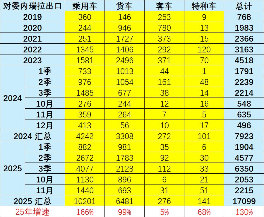 乘联分会秘书长崔东树今日向第一财经提供的数据显示,2025 年 1~11 月,中国对委内瑞拉出口的汽车达到了 17099 辆,增速 130%。其中,乘用车出口了 10201 辆,增速 166%;货车出口 1481 辆,增速 99%。