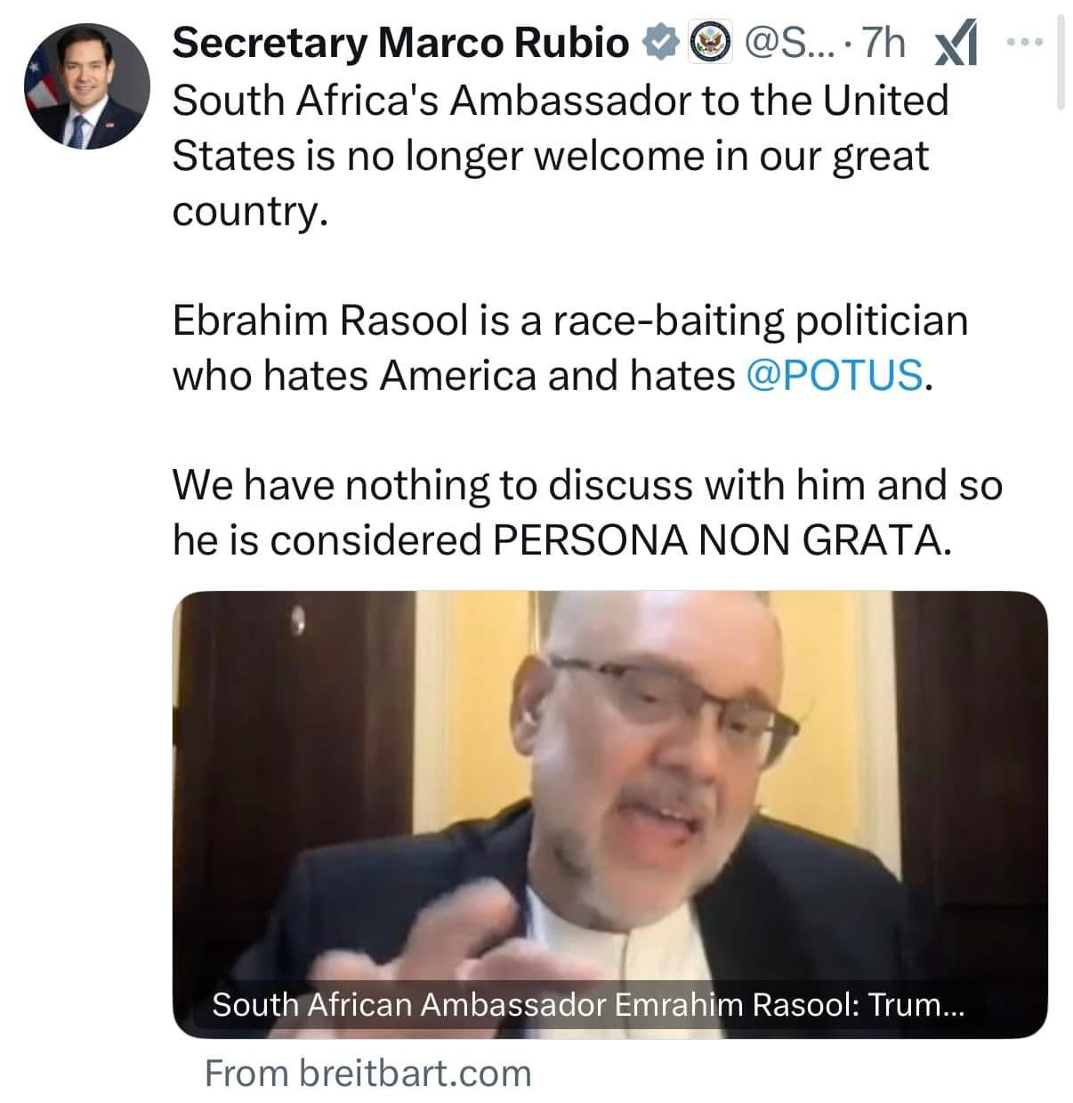 美国实际上已经驱逐了南非驻华盛顿大使易卜拉欣·拉苏尔,此前美国国务卿马可·卢比奥指责他是“仇恨美国”和唐纳德·特朗普总统的“种族煽动政客”。
