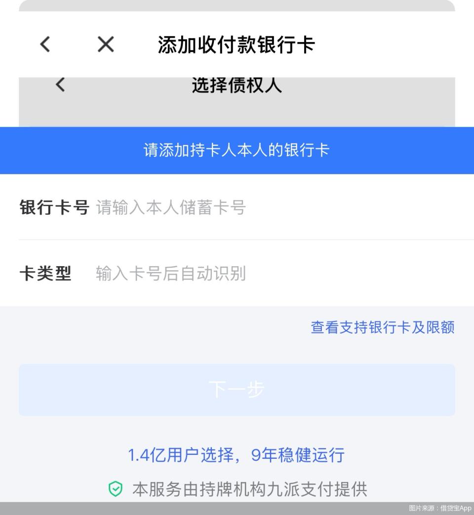北京商报记者在实测中注意到,不仅是借贷宝 App 在首页为九云小贷提供导流服务,用户在使用 " 打欠条 " 功能时,需要进行实名认证并添加本人银行等。页面下方提示,相关服务由持牌支付机构九派支付(即 " 九派天下支付有限公司 ")提供。