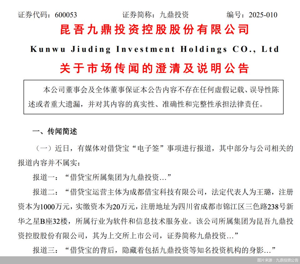 借贷宝遭 "3 · 15" 晚会点名后,其与 " 九鼎系 " 的关系引发市场热议。3 月 16 日下午,九鼎投资运营主体昆吾九鼎投资控股股份有限公司发布公告称,"3 · 15" 曝光的借贷宝产品是成都借宝科技有限公司(以下简称 " 成都借宝科技 ")旗下品牌,九鼎投资与成都借宝科技、人人行科技不存在股权控制关系。截至本公告披露日,公司及公司历史管理的基金从未参与过成都借宝科技和人人行科技的投资。九鼎投资除作为软件使用用户使用过该产品的部分功能外,不存在与成都借宝科技、人人行科技及其下属公司发生过业务往来的情况。