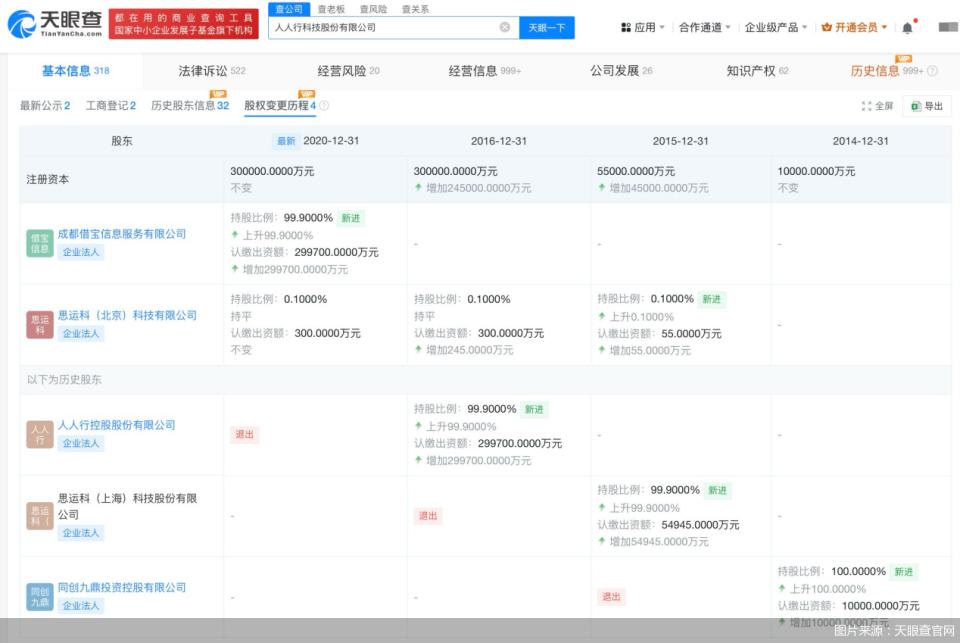 回溯人人行科技的股权变更历程,人人行科技最早由同创九鼎投资控股有限公司(以下简称 " 同创九鼎投资 ")等发起成立," 九鼎系 " 创始人吴刚担任公司董事长。随后同创九鼎投资于 2015 年年末退出公司股东行列,法定代表人及董事长由吴刚变更为王璐,人人行控股股份有限公司(以下简称 " 人人行控股 ")成为人人行科技最大股东,后于 2020 年末退出。人人行控股退出至今,成都借宝信息服务有限公司(以下简称 " 成都借宝 ")和思运科(北京)科技有限公司接任人人行科技股东,持股比例分别为 99.9% 和 0.1%。