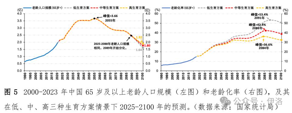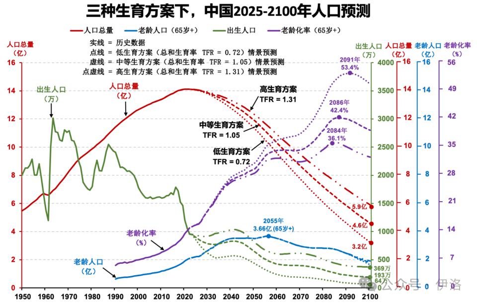 老龄化率预计 2050 年为 28.5%,2100 年 32.6%,比中等生育方案和低生育方案分别减少 6.6% 和 18.2%。