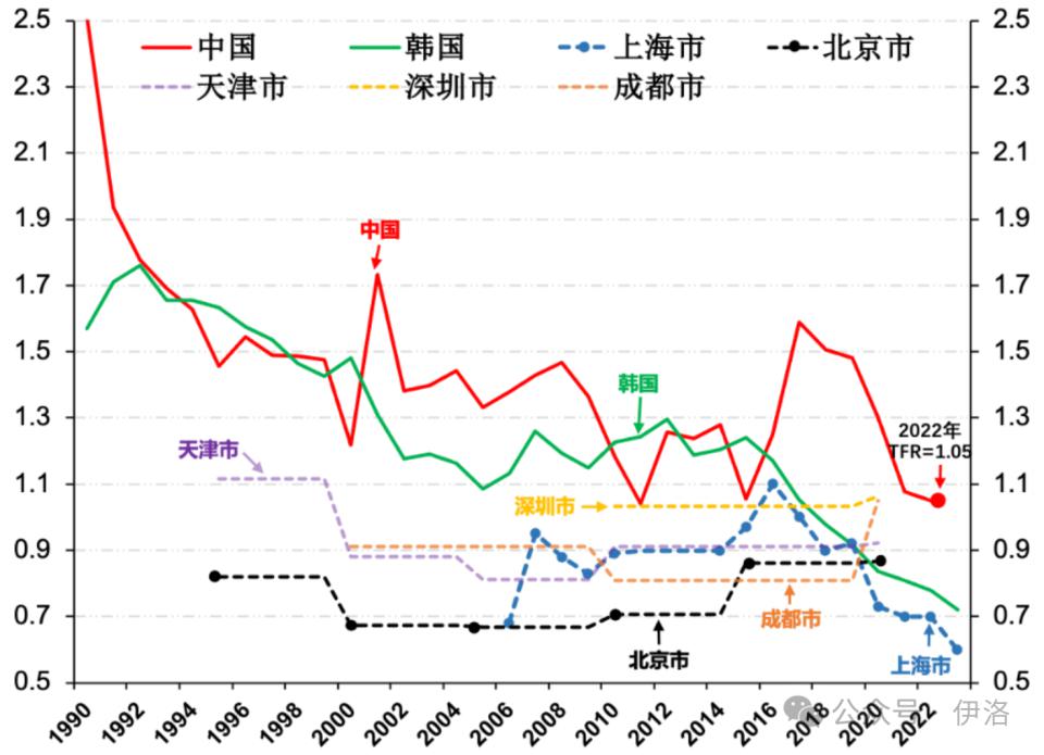 1990-2023 年中国、韩国和中国主要城市(虚线)总和生育率